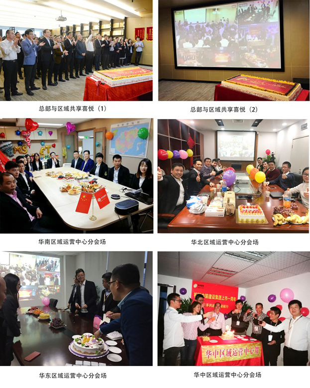 远程共享,欢喜同贺。中装建设华南区域运营中心、华北区域运营中心、华中区域运营中心、华东区域运营中心、青岛分公司等分会场与集团总部远程视频、共同庆祝中装建设上市一周年。
